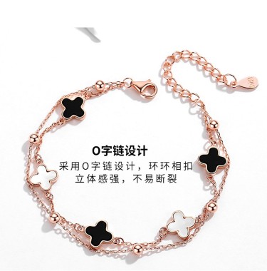 FZOG四叶草手链女时尚银镀玫瑰金饰品镶嵌黑玛瑙首饰 黑玛瑙