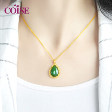 COISE 黄金项链妈妈金镶玉吊坠女999足金和田玉金坠子珠